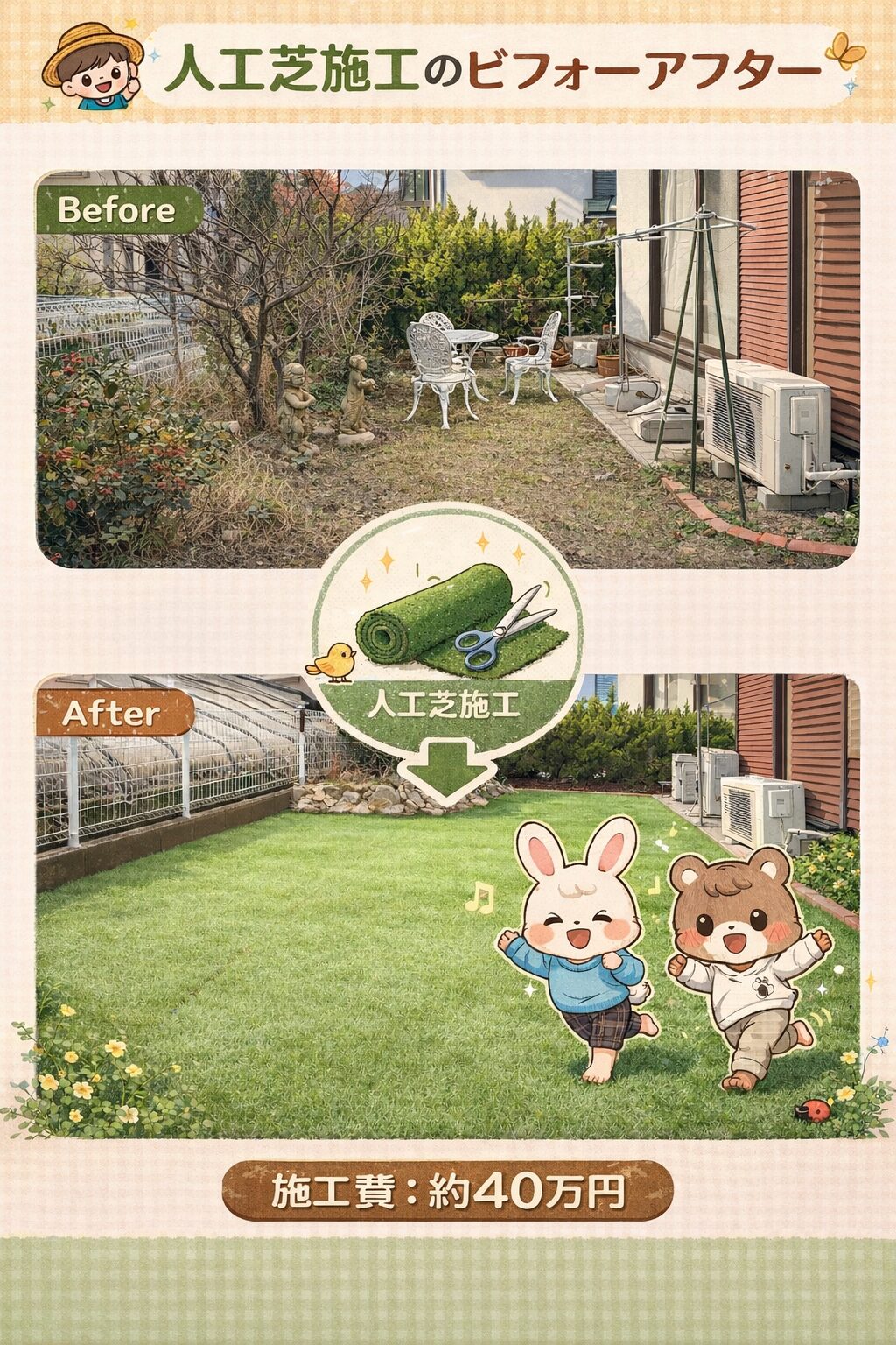 今回は植木を伐採し、人工芝を敷くことで